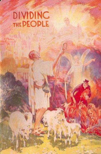 Again the same class of persons is designated by the Lord Jesus under the symbol of sheep, that is, harmless ones, to distinguish them from the goats, that is, the cruel and wicked ones amongst men. The cruel goat class are the servants of Satan and they misrepresent and maltreat Jehovah’s witnesses. Jesus likened the faithful members of his body to sheep and then said: “Other sheep I have, which are not of this fold: them also I must bring, and they shall hear my voice.” (John 10:16) These men and women of good will now see Jehovah’s witnesses actively engaged in bearing the message of truth to the people, and they render good unto such witnesses because they are serving the true God. When they see Jehovah’s witnesses suffering the contradiction of sinners and being persecuted at the hands of Satan's agents because of their faithfulness, they minister good deeds unto Jehovah's witnesses. When these faithful ones are arrested, wrongfully convicted and imprisoned, are sick and afflicted, this company of people, known as sheep or persons of good will, visit and comfort Jehovah’s witnesses. Because they want to serve Jehovah and Christ they are good to Jehovah’s servants. Therefore Jesus pronounces final judgment upon the goats and upon the sheep class; that is to say, upon the wicked persecutors and upon those of good will who minister good to God's people. To the servants of Satan he says: “Depart from me, ye cursed, into everlasting fire prepared for the devil and his angels.” Unto the sheep class, otherwise known as the Jonadab class, Jesus says: “Come, ye blessed of my Father, inherit the kingdom prepared for you from the foundation of the world: for I was an hungred, and ye gave me meat; I was thirsty, and ye gave me drink; I was a stranger, and ye took me in; naked, and ye clothed me; I was sick, and ye visited me; I was in prison, and ye came unto me.” (Matthew 25: 34-36) Let all who hear determine whether or not it is now advantageous to the peoples of earth to serve the Devil, the mimic god, or to serve Jehovah, the true God.