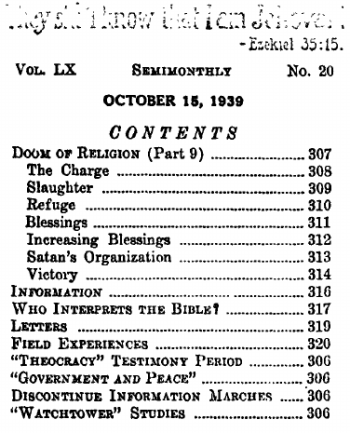 Week of November 19: “Doom of Religion” (Part 9), 1-28 inclusive, The Watchtower October 15, 1939.