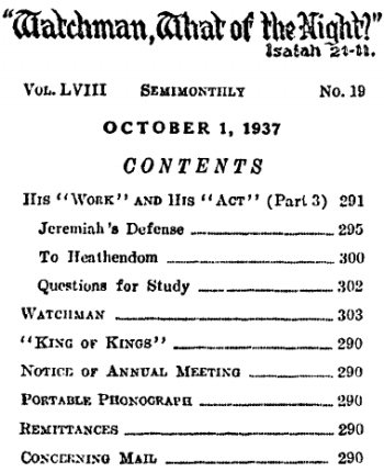 "The members of the association, whose American section is headed by Judge Joseph F. Rutherford, believe in verbal inspiration from the Bible, and seek to apply the prophecies of such books as Daniel and Revelation to current history. On the basis of Biblical passages the members of the German section, which was banned early in the Nazi regime, have predicted the collapse of the government of Chancellor Adolf Hitler.