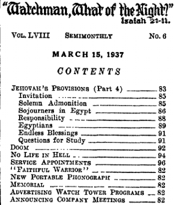 The “Faithful Warrior’’ Testimony Period, specifically referred to in Brother Rutherford’s letter ‘‘to the faithful in all the earth’’, embraces the nine-day period March 27 to April 4 inclusive. This campaign will be world-wide, and will be marked by the offer of a six-booklet combination: four colored-cover booklets and the two latest booklets, to wit, Uncovered and Protection, where these are available, all on a contribution of 25c. Full details on the campaign you will find in current issues of the Informant. Let there be the usual promptness on the part of all kingdom publishers in making report of their time in the field and the results.
