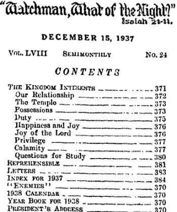 “Meat in due season’’ indeed is the June 1 (1937) Watchtower. My heart is filled with gratitude as 1 reside at the table of the Most High and inquire in his temple. Dear Brother Rutherford, how Jehovah has blessed you and through you His people on earth! How wonderful to know our heavenly Father is ever watchful of his little ones, and is guiding them in the right way through Christ Jesus, and He through The Watchtower! May he ever bless you as you seek to serve him. I hope to remain Your sister in His service,