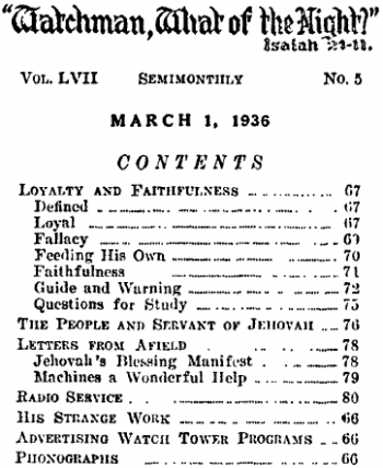31 Jehovah has never put his stamp of approval upon an unfaithful man, nor one who is partially unfaithful. God’s rule shows that faithful men of old were approved because of their faithfulness; likewise those of the royal house and of the great multitude must prove faithful and true to the Lord. In God’s organization men are selected and sent forth to give aid to others that they may have a better understanding of their privileges of serving God and Christ. It is a small matter for them to do what they are asked to do in the service of the Lord. The truth is not the product of any man. The truth is the Word of God, who through Christ Jesus teaches his people. The Lord gives interpretation to his prophecies and causes the same to be published. It is the bounden duty of those sent to the companies of God’s people, therefore, to give consideration to what is published by the Lord’s organization for the aid and comfort of his people. If one is sent to a company and he disregards or fails to recognize the Watch Tower publications and the subject matter treated in The Watchtower, and in place and stead thereof substitutes his own private interpretation, the course of that man is both lawless and unfaithful; lawless, because of his failure or refusal to be obedient to organization instructions; unfaithful, because of pride and a disposition to exalt himself, and hence a failure to safeguard the kingdom interests. Men are not sent to the companies to exhibit their own learning and wisdom, nor to exhibit the learning of any other man. The kingdom is here, and the Lord’s commandment to those in line for the kingdom is that they must go and tell these great truths to others as a witness to the name of Jehovah. (Matt. 24:14) It is of God, his King, his purpose and his truth that is to be told to the people. As certain as the Lord has caused these truths to be published in The Watchtower the one who fails or refuses to use the same and substitutes his own ideas or teachings is lawless and unfaithful to the duties and obligations laid upon him. This does not mean that such a servant must read The Watchtower to the companies, but it does mean that he will discuss, consider, and elucidate the subject matter that is treated in The Watchtower and try to help the members of the companies to get a better understanding thereof, that they may all be better equipped for the service of the Lord as commanded.
