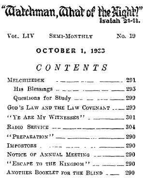 It adheres strictly to the Bible as authority for its utterances. It is entirely free and separate from all parties, sects or other worldly organizations. It is wholly and without reservation for the kingdom of Jehovah God under Christ his Beloved King. It is not dogmatic, but invites careful and critical examination of its contents in the light of the Scriptures. It does not indulge in controversy, and its columns are not open to personalities.