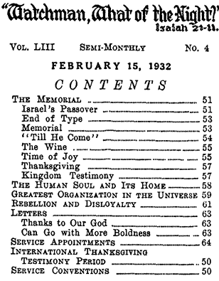 26 In almost all lands of Christendom one day is specifically set aside and designated as “Thanksgiving Day”. Why should any of God’s anointed people observe such a day? It is a day fixed by men who are under the control of Satan, and the practices in connection with the day by them are hypocritical. God's kingdom is here. It is a time of joy and thanksgiving for his people every day. If, however, it seems well to observe a specific day of thanksgiving, the appropriate day would seem to be the day of the celebration of the Lord’s memorial. The proper day for the celebration of the Lord’s memorial for the year 1932 will be March 20, after 6 p.m. If it please the people of the Lord God now on the earth let this day be now set aside and henceforth designated and observed as a thanksgiving day unto Jehovah. The day according to Biblical reckoning begins at six p.m. Let the Memorial be celebrated after six p.m., and the twenty-four-hour day which there begins be celebrated as a thanksgiving day unto Jehovah God: a time of joy and thanksgiving, because God’s kingdom is here and the time for the vindication of Jehovah’s name has come. Let this day also be the beginning of a service period and be designated as International Thanksgiving Testimony Period. This period of time will begin on the 20th day and end on the 27th day of March, 1932. This will be celebrated by God’s people as ‘a feast of joy and thanksgiving unto the Lord’, having particularly in mind our privilege of drinking the fruit of the vine new with our Lord in our Father’s kingdom and our privilege of being Jehovah’s witnesses and bearing testimony to his name.—Matt. 26: 29.