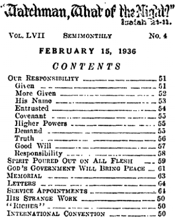 23 Why the emphatic demand that the truth now be told with greater plainness than ever before? Is it for the benefit of the Lord? Certainly not for the Lord’s benefit, because after the servant has done all he is still an unprofitable servant to the Lord. No one can bring any benefits to God. This is the ‘day of his power’, and before God will have his power employed for the destruction of the wicked one it is his purpose to have the warning given, that each one may bear his own responsibility. Israel symbolically stands for those who desire to serve and undertake the service of God, and it is the will of God that all such shall receive some knowledge. A watchman is one who watches out for and safeguards the interests that are committed into his keeping. God begins to exercise his power relative to the earth through Christ Jesus, and he provides a watchman for his kingdom interests on earth. That watchman is not one man, but is collectively made up of the “faithful and wise servant” class to whom God’s kingdom interests on earth are now entrusted. The Lord’s judgment day is here, and the hour rapidly approaches when he will destroy all the wicked who persist in their wickedness. To the “faithful servant” class the Lord therefore says: “I have made thee a watchman unto the house of Israel: therefore hear the word at my mouth, and give them warning.” Then says the Lord to the watchman: ‘If you give them not warning and they die, their blood I will require at your hands.’ (Ezek. 3: 17-20) Here the Lord’s Word clearly shows that he has laid upon the servant class the duty of giving warning and information to others, that he makes his witnesses responsible for performance and demands full and complete obedience and performance by his servant, and he places responsibility upon all others who hear. It is the final testimony before the showdown between the Lord and the Devil.