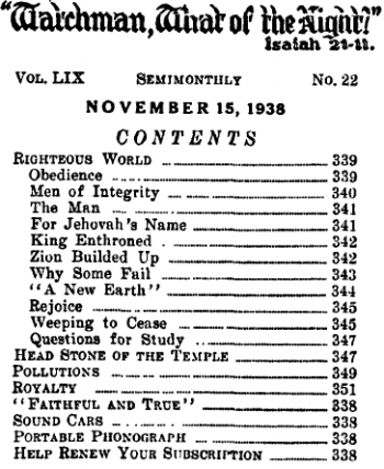 JEHOVAH purposed to have a world that is wholly righteous, and his purpose shall be accomplished. The “world” consists of the heavens, invisible to human eyes, and the earth, which is visible to human eyes. Everything in that righteous world must be righteous and do that which is right to the praise of Jehovah. The apostle, with full faith in God and moved by the spirit of the Almighty, wrote: “We, according to his promise, look for new heavens and a new earth, wherein dwelleth righteousness.” (2 Pet. 3: 13) Such new world, in the Scriptures, is designated “the world to come” and that is a “world without end”. (Heb. 2:5; 6:5; Eph. 3:21) The new heavens consist of Christ Jesus, the Head and Lord thereof, together with the members of his royal house, and also the angels of heaven, all being righteous and fully loyal to God and faithful in their devotion to him. The new earth will consist of righteous men who in times of old proved their integrity toward God and whom the Lord shall “make princes in all the earth”, which princes shall rule in righteousness under the direction of the righteous Lord (Ps. 45: 16; Isa. 32: 1); and also of the human creatures known as the “great multitude”, their offspring, and others who shall be made righteous. Every creature that will dwell for ever in the new earth must be righteous, and the righteous will never die. (Matt. 25: 46) In this present day the Lord of heaven and earth is gathering unto himself his “other sheep”, otherwise known as “Jonadabs”, and who will form the “great multitude” (Rev. 7: 9-15), and they and their faithful offspring will be a part of the “new earth, wherein dwelleth righteousness”. Today the Jonadabs should be very diligent to gain a knowledge and understanding of Jehovah’s purpose and the manner or way in which he is building the new earth. With knowledge, and having a pure motive, they shall learn wisdom and gain understanding: “Happy is the man that findeth wisdom, and the man that getteth understanding: for the merchandise of it is better than the merchandise of silver, and the gain thereof than fine gold. She is more precious than rubies; and all the things thou canst desire are not to be compared unto her. Length of days is in her right hand; and in her left hand riches and honour. Her ways are ways of pleasantness, and all her paths are peace. She is a tree of life to them that lay hold upon her; and happy is every one that retaineth her.”—Prov. 3: 13-18.