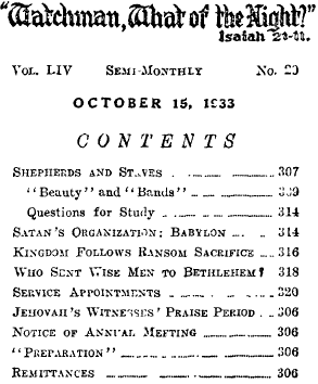 21 Zechariah then broke the staff, Bands, or, Binders, which pictured the covenant for the kingdom. “Then I cut asunder mine other staff, even Bands, that I might break the brotherhood between Judah and Israel.” (Zech. 11:14) The breaking of the brotherhood between the ten tribes of Israel and the tribe of Judah after the death of Solomon was due to their unfaithfulness to the kingdom covenant and to idolatry on the part of the reigning house of Solomon (1 Ki. 12:19-24; 11:4-13), and also to the refusal on the part of the ten tribes to longer submit to God’s will concerning the kingdom covenant. (Gen. 49:10; 2 Sam. 7:4-17; Ps. 89:3, 4, 35-37) Israel refused to be ruled by the house of David with whom the kingdom covenant had been made. Likewise in the fulfilment of the prophecy of Zechariah, the breaking of the covenant with “organized Christianity” is shown in the breaking of the stave Bands, or, Binders. Catholics and Protestants and others have assumed to be in the covenant to do the will of God and in the covenant for the kingdom. Those who form “organized Christianity”, so called, have broken that covenant by idolatry or Devil worship, making themselves a part of Satan’s organization, and by refusing to be submissive to the requirements of the “Lion of the tribe of Juda”, which refusal reached an emphatic climax in the endorsement of the League of Nations, in 1919, by the Church Federation. There they took a positive stand in opposition to Jehovah and his kingdom. These, together with all who have rejected the Lord Jesus at his coming to the temple, have broken the covenant with Jehovah, and no longer could he shepherd that rebellious flock. The book Vindication deals fully with this matter. The time when Zechariah, God's faithful remnant, figuratively broke the staff Bands was at the adoption of the resolution on July 26, 1931, at which time Vindication and other like kingdom messages were published and served upon the followers of “Christendom”. The pouring out of the “seven last plagues”, from 1922 to 1928, did not move ‘‘Christendom’’ and other professed followers of Christ to repentance; hence the breaking point came in 1931. It was at that time that the remnant disclaimed all brotherhood relationship with those rejecting the kingdom, and this they did by receiving and adopting the “new name’’ which Jehovah gave them. The enemy has falsely charged Jehovah’s witnesses with changing their name for the purpose of deception. This is in keeping with the action of Satan’s organization. God himself gave the new name and foretold this long ago, and the faithful ones, as Zechariah did, merely carried out his will which he had long ago declared should be done. Thus receiving the new name, and breaking all relationships with those who oppose the kingdom, the faithful remnant submit their case to Jehovah, declaring themselves wholly for his kingdom and that they have nothing in common with any organization that has to do with Satan. (2 Cor. 6:15-18) After having broken the staffs “Beauty” and “Bands”, then the Lord commanded Zechariah to take the instruments of the “foolish shepherd [worthless shepherd, Roth.]”. (Verse 15) These instruments are the tools or equipment for service. The former holders thereof having forfeited their right to use them because of having become foolish, that is to say, perverse, and failing to perform their duties and obligations, such are not permitted on the “highway”, and their opportunity for service is taken away by the faithful ones. (See Isaiah 35:8, A.R.V.) This part of the prophecy applies to the “evil servant” class, “the man of sin”, described by Christ Jesus in Matthew 24:48-51; 25:26-30; Luke 19:24-26. “The fool shall be servant to the wise of heart.” (Prov. 11: 29) The Watchtower of February 1 and March 1, 1923, specially called attention to the transfer of the kingdom interests or “goods” of the shepherd from the foolish to the “faithful and wise servant” class. It was then known by the remnant, the “faithful servant” class, that the Lord was at the temple; but the foolish servant rejected the truth, showing that the temple is not for them. The remnant immediately responded to take up the instruments that the Lord had taken from the foolish ones and to use them to his praise.