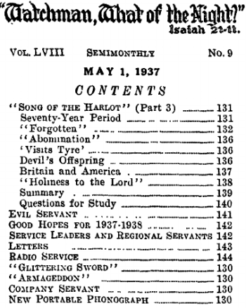 11 The events above mentioned were approximately seventy years after November 24, 1848, at which time the pope, in disguise, fled from Rome. On February 8, 1849, the Italian government divested the pope of all temporal power. But these facts appear to be merely incidental to the prophecy, and not in fulfillment thereof. These facts would help to conceal the true meaning of the prophecy for a time and until God’s due time for it to be understood. The prophecy (vs. 15) further says: ‘After seventy years [of desolation typical and antitypical] shall Tyre sing as an harlot.’ Other translations render this part of the prophecy in this manner, to wit: “It shall be unto Tyre as in the song of the harlot” (R.V.); “shall it befall Tyre according to the song of the harlot” (Rotherham), “there shall be unto Tyre as the song of a harlot” (Douay); “shall it happen to Tyre as in the song of the harlot.” (Leeser) Note that it is not a song by the harlot, but “as in the song of the harlot”; and that appears to be the reason why Leeser in translating this text puts verse sixteen in quotation, and thus verse sixteen is “The Song”. That “Song of the Harlot” must be and certainly is a prophecy of the Lord concerning the harlot religious system, that is, the Roman Catholic organization, allies and supporters, and which prophecy foretells her conduct immediately following the end of the period in which she is forgotten. The song begins to revive her traffic and patronage and her efforts to gain her chief objective, to wit, to rule the nations of the earth as the vicegerent of Christ and in a dictatorial way.