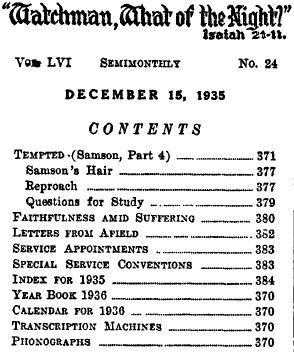 The text “For Jehovah and for Gideon” (Judges 7:18, A.R.V.) is appropriate for Jehovah’s publishers, and therefore it will be used for 1936 the same as for 1935. Calendars are being prepared for those who desire them. The same illustration will be used; however, the general design and appearance will be different, the calendar pad, of course, for the year 1936. The companies and individuals will please send in orders as soon as possible, as we have printed only what we estimated are required. The price will be, for single calendar, 25c; for lots of five or more, 20c each.